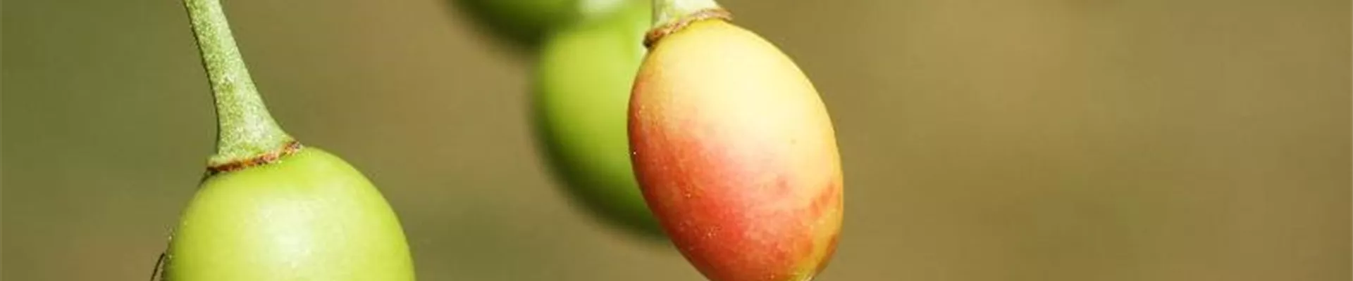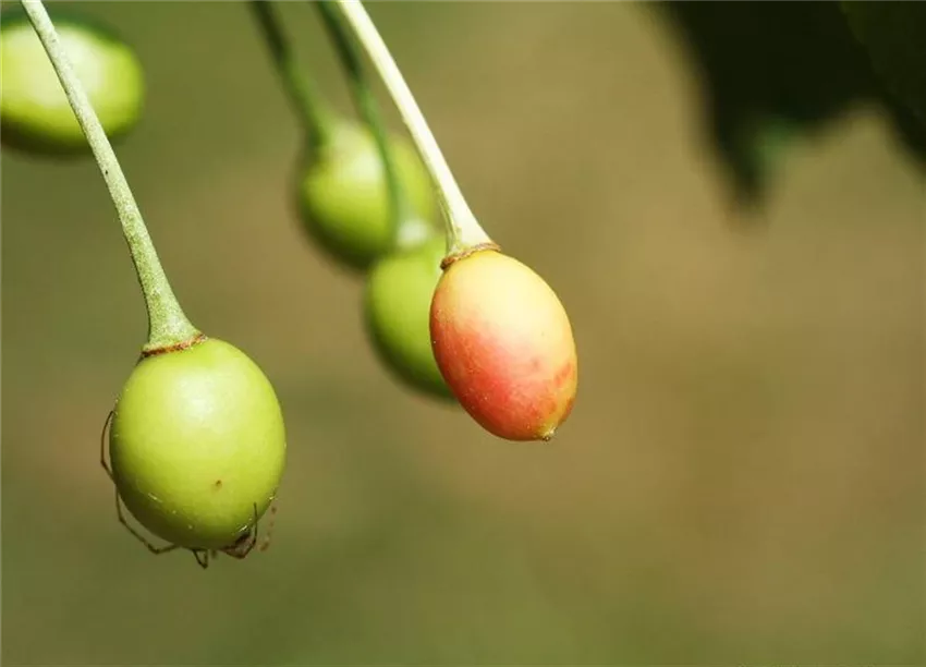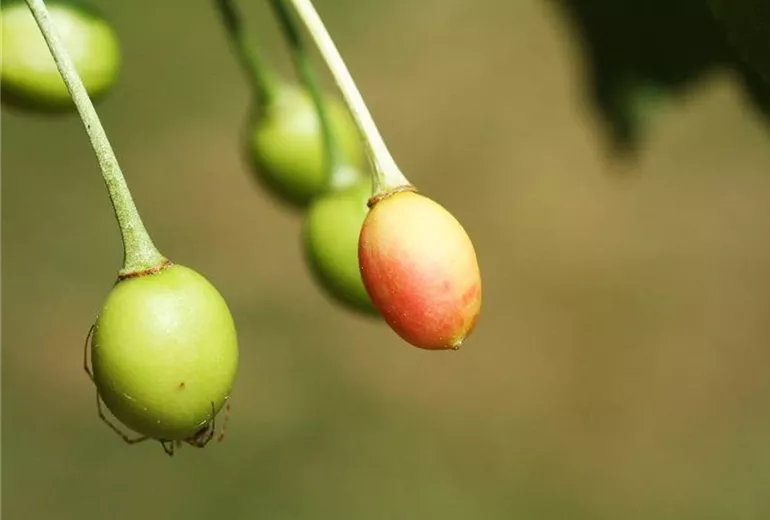 Schon im Juni färbt sich ein Teil der noch nicht ausgewachsenen etwa erbsengroßen Früchte rot. Diese Kirschen trocknen ein und fallen vorzeitig ab.