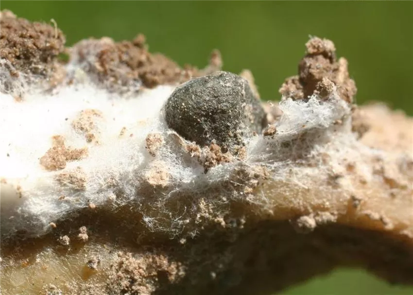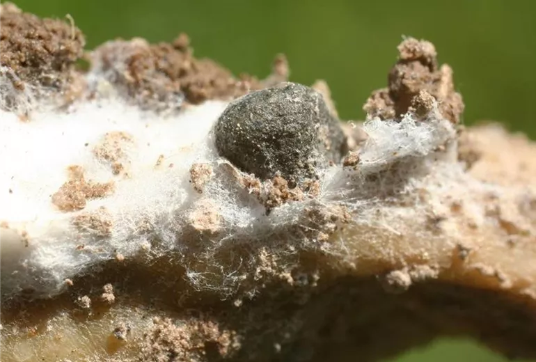 Im watteartigen Mycel des Sclerotiniapilzes entstehen auffällig große, schwarze, kornartige Gebilde. Es handelt sich dabei um so genannte Sclerotien, die im Boden viele Jahre überdaueren und so zu einer Verbreitung des Pilzes beitragen.