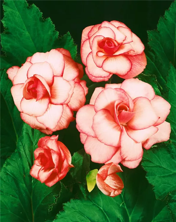 Begonia elatior 'Heidi (Netja-Gruppe)' bildet während der gesamten Saison zahlreiche gefüllte, schalenförmige, rosafarbene, weiße, zweifarbige Blüten.