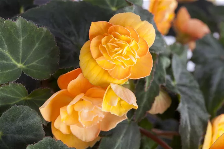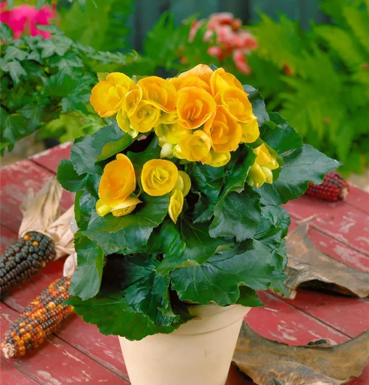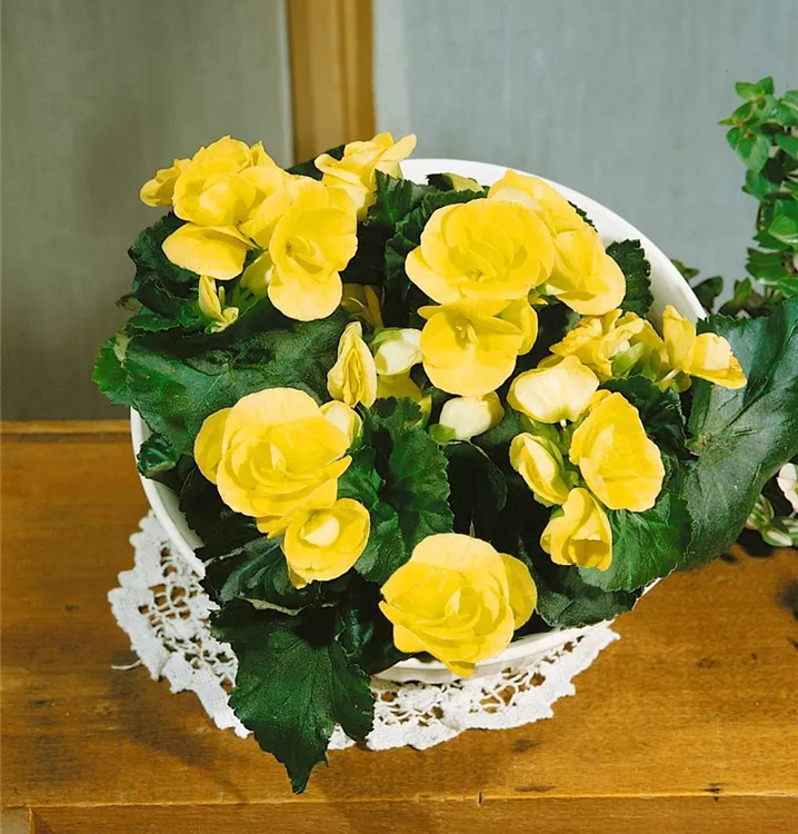 Die Begonie (Begonia elatior) ist eine gelb blühende Pflanze, die dreieckige, gesägte Blätter trägt. Ihre schalenförmigen Blüten erscheinen von April bis September. Diese kompakte Pflanze gedeiht am besten an einem sonnigen bis halbschattigen Standort.
