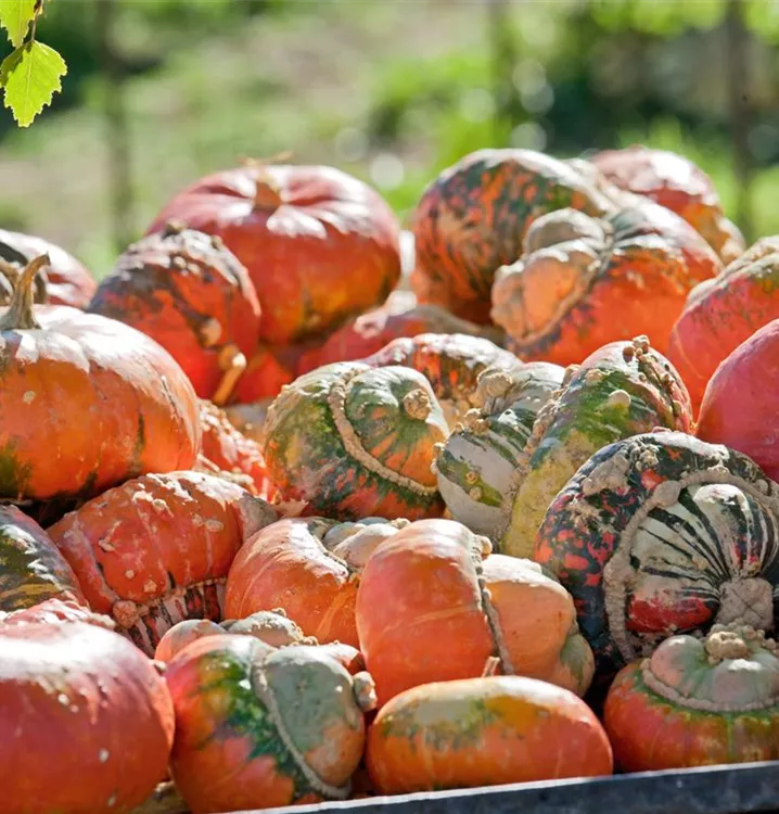 Der Kürbis 'Bischofsmütze' (Cucurbita maxima) bildet große Früchte, die aromatisch, wohlschmeckend schmecken und bereits ab September geerntet werden können. Für das optimale Wachstum des Kürbises 'Bischofsmütze' werden ein sonniger Standort und durchlässiger, nährstoffreicher Boden benötigt.