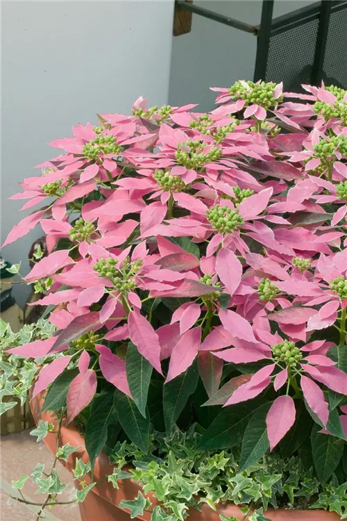 Der Weihnachtsstern (Euphorbia pulcherrima) ist eine rosa blühende Pflanze, die breit lanzettliche, lanzettliche Blätter trägt. Diese buschige Pflanze gedeiht am besten an einem sonnigen Standort.