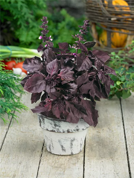 Das Garten-Basilikum 'Atropurpureum' (Ocimum basilicum) ist eine Kräuterpflanze mit einem würzigen Geschmack. Seine rot-braunen Blätter sind eiförmig und gewellt, gezähnt. Für das optimale Wachstum des Garten-Basilikums 'Atropurpureum' werden ein sonniger Standort und durchlässiger, nährstoffreicher Boden benötigt.