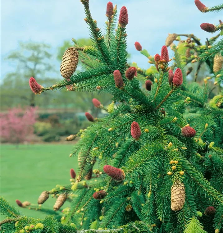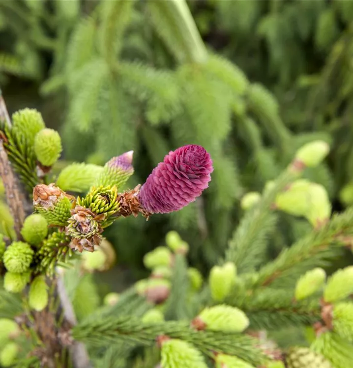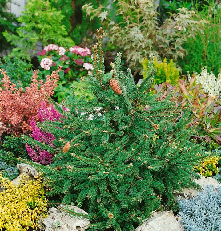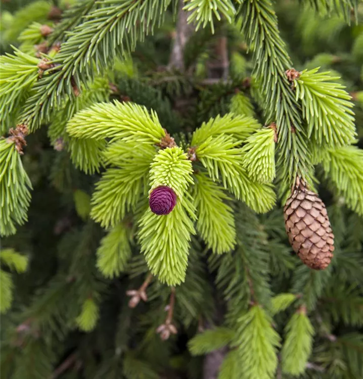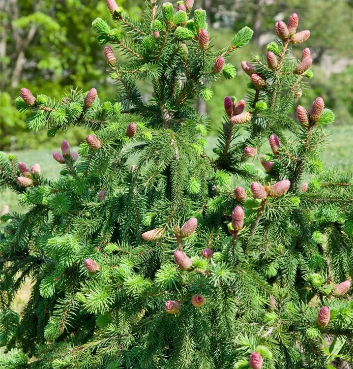 Zapfen-Fichte 'Acrocona' ist ein kegelförmig, breit wachsender, malerischer Kleinbaum. Sie erreicht gewöhnlich eine Höhe von 2 - 5 m und wird ca. 2 - 4 m breit. Langsam wachsend. In der Regel wächst sie 8 - 10 cm pro Jahr.