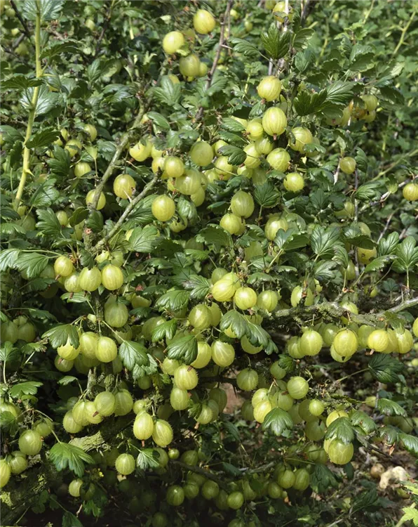 Ribes uva-crispa 'Hinnonmäki', gelb bevorzugt nährstoffreiche, ausreichend feuchte Erde.