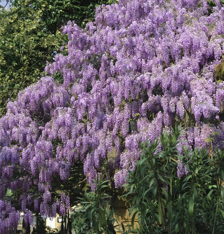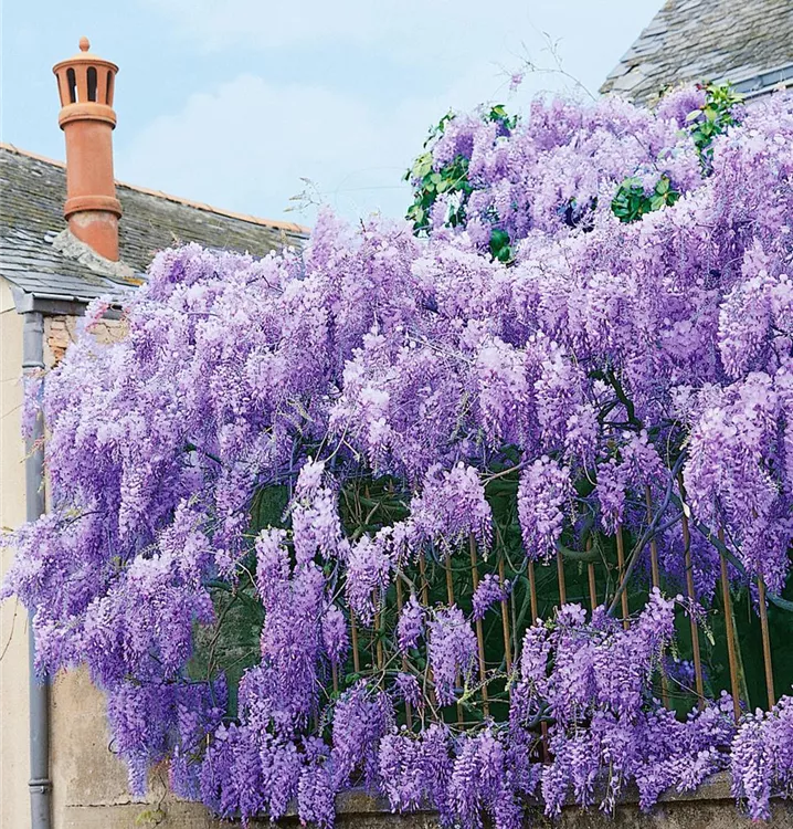 Der Chinesische Blauregen (Wisteria sinensis) eine rankende Gartenpflanze, die, je nach Sorte, Blüten in verschiedenen Farben hervorbringt. An einem sonnigen bis halbschattigen, windgeschützten Standort mit durchlässigem, lockerem, nährstoffreichem Boden erreicht er gewöhnlich eine Höhe von ca. 15 m und wird ca. 10 m breit.