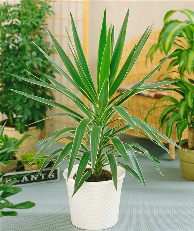 Die Riesen-Palmlilie 'Gold Jewel' (Yucca elephantipes) trägt dunkelgrüne, gelb-grüne, lineale, matte Blätter. Diese aufrechte Pflanze gedeiht am besten an einem sonnigen Standort.