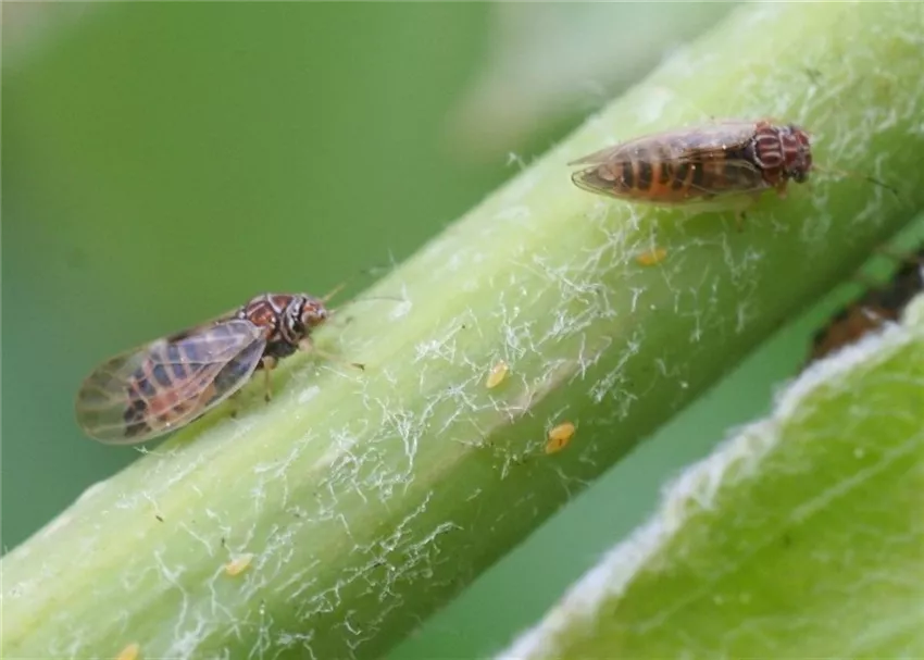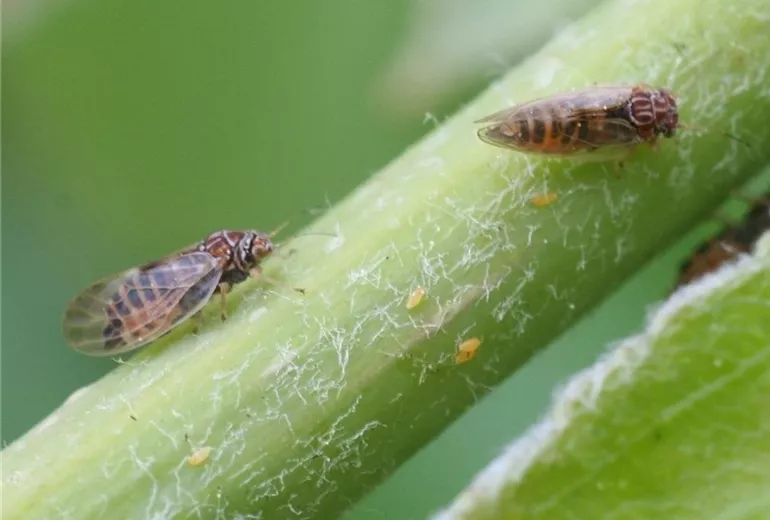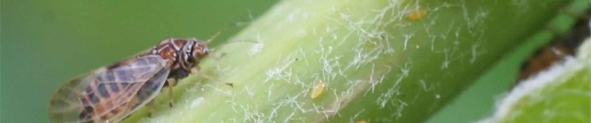 Die größten Schäden verursacht der Gemeine Birnenblattsauger, da er mehrere Generationen pro Jahr bildet.