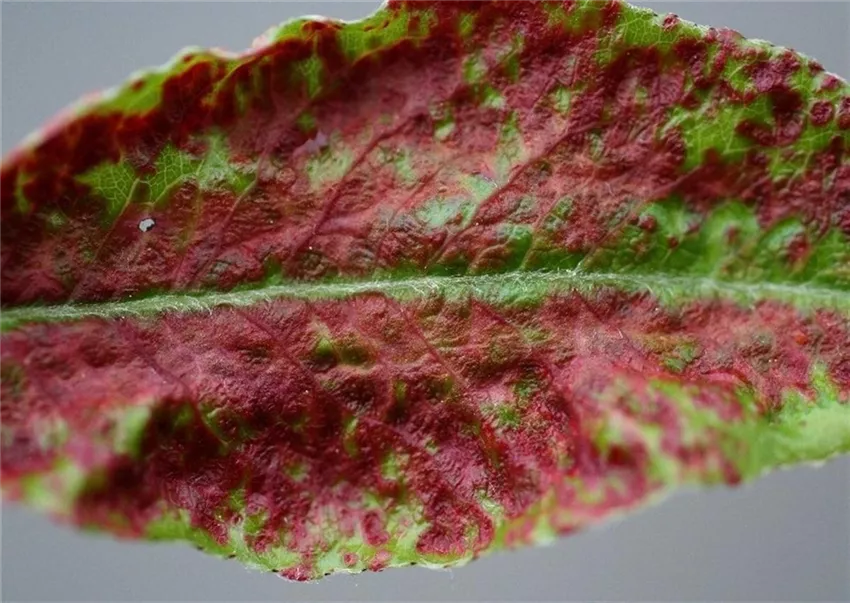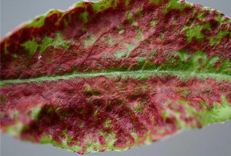 Die Blätter zeigen anfangs hellgrüne bis rötliche, später schwarzbraune, blasenartige Emporwölbungen (Pocken).