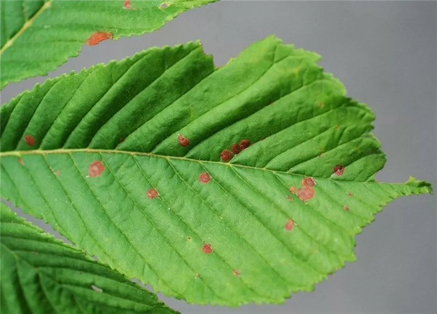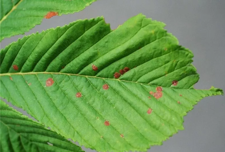 Im Sommer entstehen auf den Blättern anfänglich gelbe, später braune Flecken, die gelb umrandet sind. Bei starkem Befall rollen sich die Blätter nach oben ein, vertrocknen und fallen vorzeitig ab.