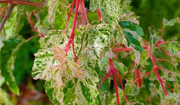 Die sommergrünen Blätter des Strauchahorns sind grün-weiß. Strauchahorn zeigt sich leuchtend gelb im Herbst.