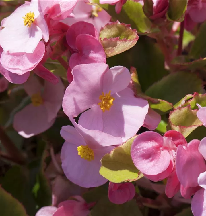Ihre lange Blütezeit, die Zierlichkeit der Kronblätter und ihre asymmetrischen, meist eiförmigen Blätter charakterisiert die brasilianische Art Begonia semperflorens. Diese Begonien besitzen grünes bis rötliches Laub und umfassen Vertreter weißer bis roter Blütenfarbe. Ihre Blätter brechen schnell, weshalb sie auch den Namen Eis-Begonie tragen. Ihre Wuchshöhe beträgt maximal dreißig Zentimeter.