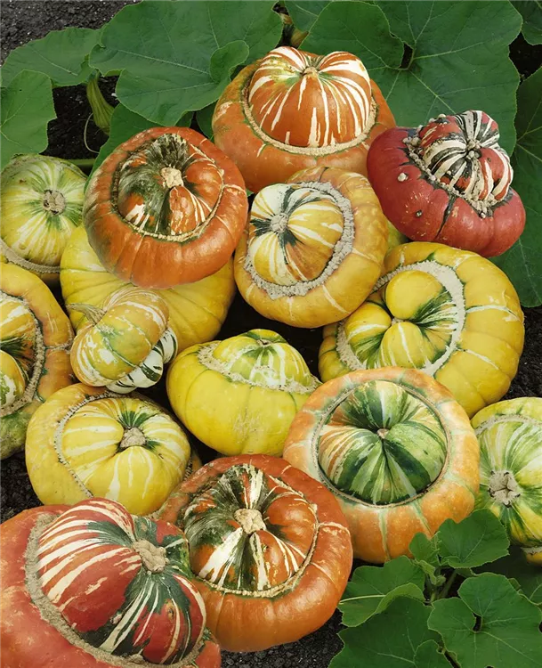 Der Kürbis 'Bischofsmütze' (Cucurbita maxima) bildet große Früchte, die aromatisch, wohlschmeckend schmecken und bereits ab September geerntet werden können. Für das optimale Wachstum des Kürbises 'Bischofsmütze' werden ein sonniger Standort und durchlässiger, nährstoffreicher Boden benötigt.