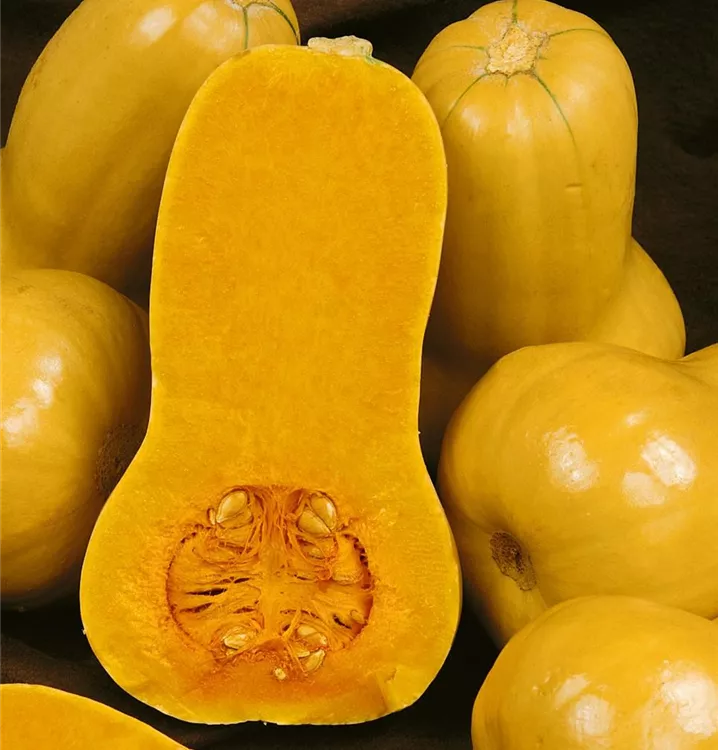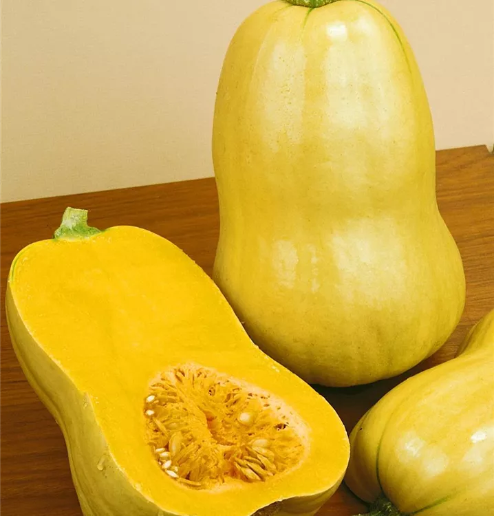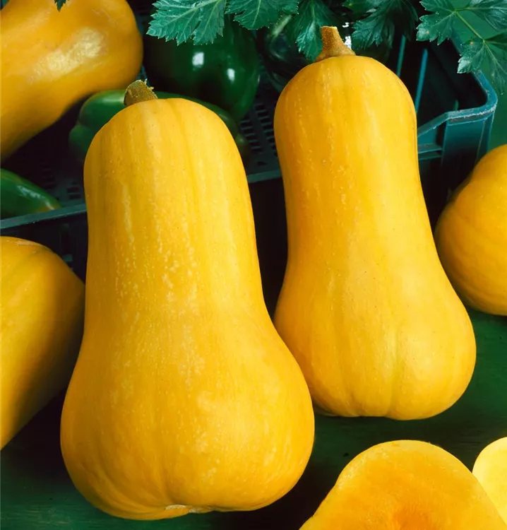 Der Moschus-Kürbis 'Butternut' (Cucurbita moschata) bildet kleine Früchte, die aromatisch, süß schmecken und bereits ab Juni geerntet werden können. Für das optimale Wachstum des Moschus-Kürbises 'Butternut' werden ein sonniger Standort und durchlässiger, nährstoffreicher Boden benötigt.