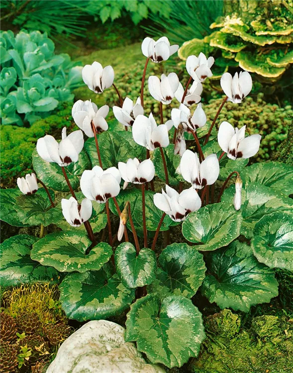 Das Herbst-Alpenveilchen (Cyclamen hederifolium) blüht über Monate hinweg. Je nach Sorte, erscheinen die dekorativen Blüten in den Farben Pink, Weiß und Rosa. Die grün-weißen, herzförmigen Blätter sind ganzrandig. Bevorzugt wird ein sonniger bis halbschattiger Standort und eine durchlässige Erde.
