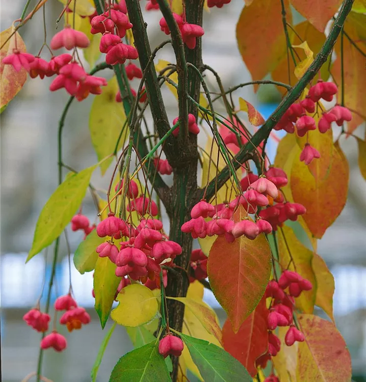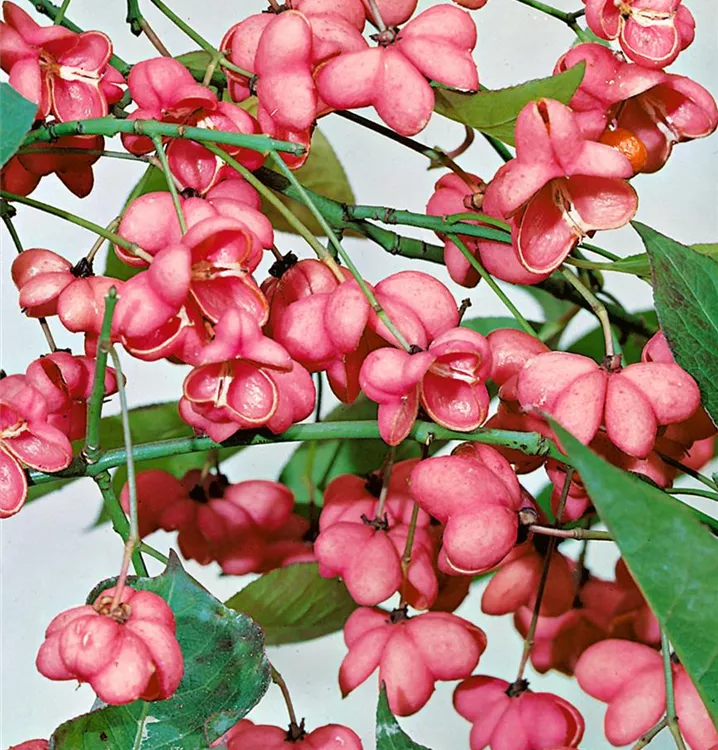 Besonders dekorativ sind die rosaroten Früchte von Euonymus europaeus. Diese erscheinen ab August.