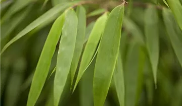 Die immergrünen Blätter des Schirmbambus sind dunkelgrün, lanzettlich.