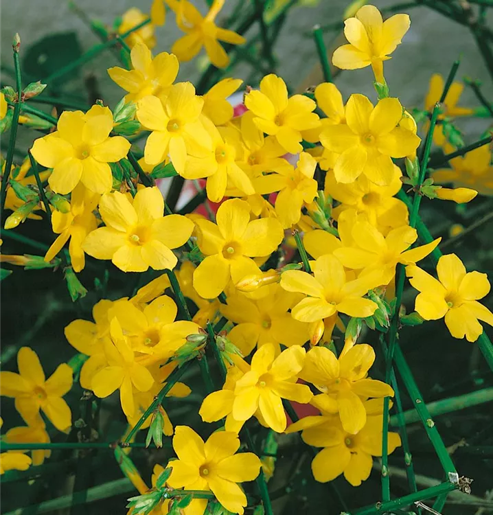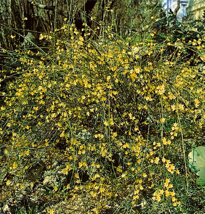 Der Echte Winter-Jasmin (Jasminum nudiflorum) ein lockerer, überhängender Strauch, der, je nach Sorte, radförmige Blüten in verschiedenen Farben hervorbringt. Seine Rinde ist hellbraun. An einem sonnigen bis halbschattigen Standort mit durchlässigem, nährstoffreichem Boden erreicht er gewöhnlich eine Höhe von ca. 3 m und wird ca. 3 m breit.