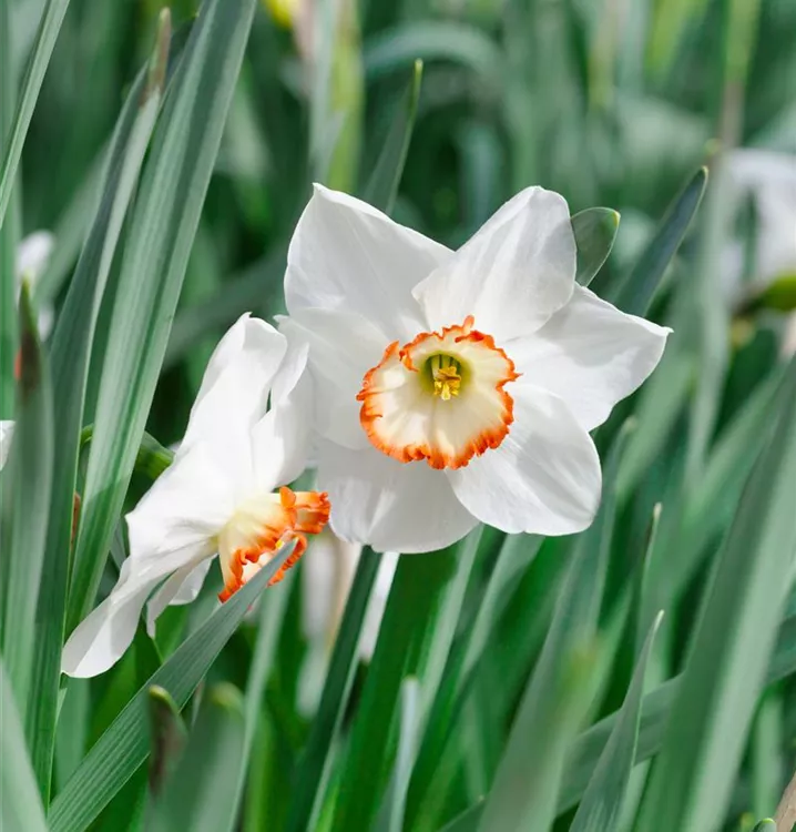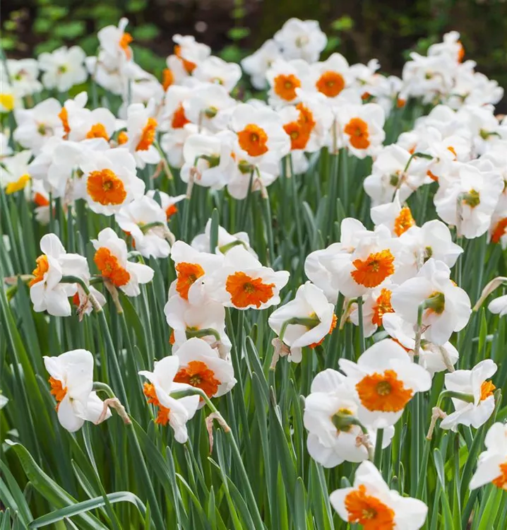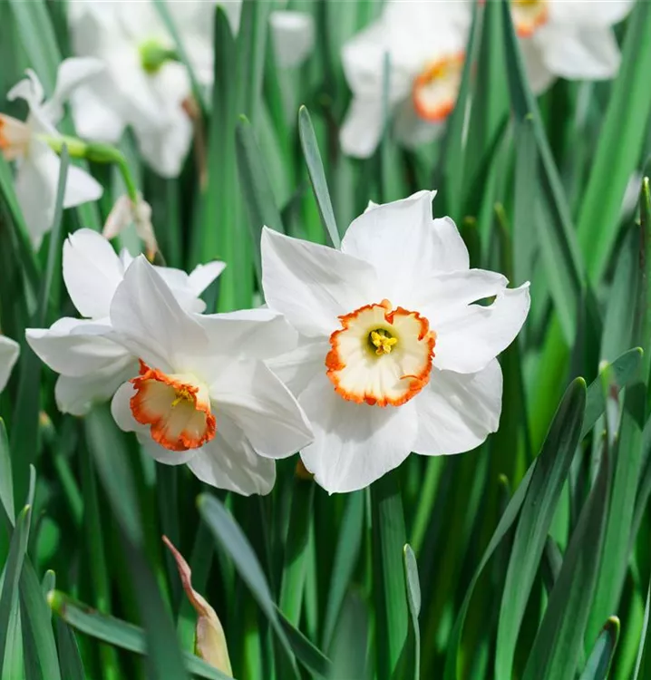 Die Narzisse (Narcissus) blüht über Monate hinweg. Je nach Sorte, erscheinen die dekorativen Blüten in den Farben Weiß, Gelb und Orange. Bevorzugt wird ein sonniger Standort und eine durchlässige Erde.