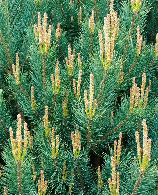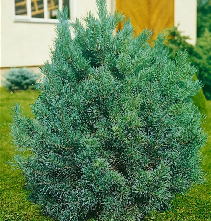 Silberkiefer 'Watereri' ist ein breit wachsender Großstrauch mit geschlossener Krone. Sie erreicht gewöhnlich eine Höhe von 4 - 5 m und wird ca. 4 - 6 m breit. Langsam wachsend. In der Regel wächst sie 10 - 12 cm pro Jahr.