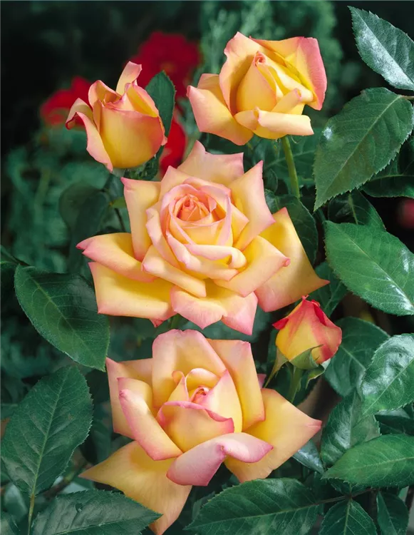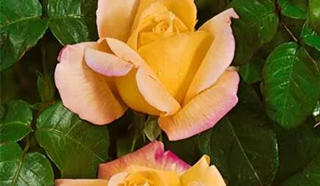 Die Edelrose 'Peace' (Rosa) ist eine reichblühende Rose, die im Garten eine besondere Rolle spielt. Die zahlreichen gefüllten Blüten sind apricot und erscheinen von Juni bis Oktober. Ihr wunderbarer Duft entfaltet sich besonders an sonnigen, warmen Tagen. Mit den richtigen Begleitern an ihrer Seite, kommt die Königin der Blumen besonders gut zur Geltung. Niedrige Stauden, Lavendel und Salbei eignen sich ganz gut für diese Zwecke.