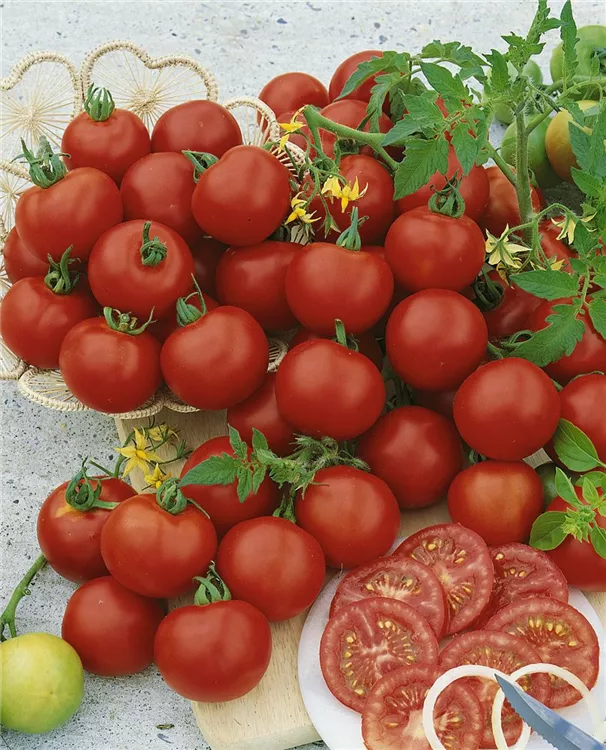 Die Tomate 'Harzfeuer F1' (Solanum lycopersicum) bildet mittelgroße Früchte, die aromatisch, würzig schmecken und bereits ab Juli geerntet werden können. Für das optimale Wachstum der Tomate 'Harzfeuer F1' werden ein sonniger Standort und durchlässiger, nährstoffreicher Boden benötigt.